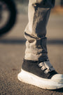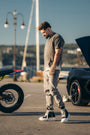 Goth Grey Jeans are cut to a loose fit with a low waist, baggy legs and an extended length. Crafted from stretch denim in a vintage goth grey with distressed effects and raw ankle hem.